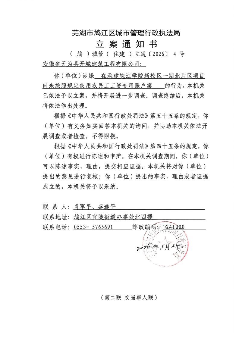 蕪湖市鳩江區城市管理行政執法局立案通知書——(鳩)城管(住建)立通〔2026〕4號