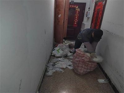 圖為社區工作人員黨員志愿者清理電梯小廣告