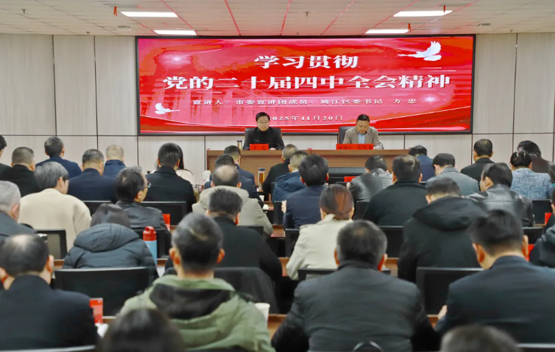 按照市委統一部署,11月20日下午,鳩江區專題召開學習貫徹黨的二十屆四中全會精神宣講報告會。市委宣講團成員、鳩江區委書記方忠作宣講報告,區委副書記、區長黃萬勇主持報告會。區人大常委會主任畢道群,區政協主席童向東,區四大班子負責同志等出席。