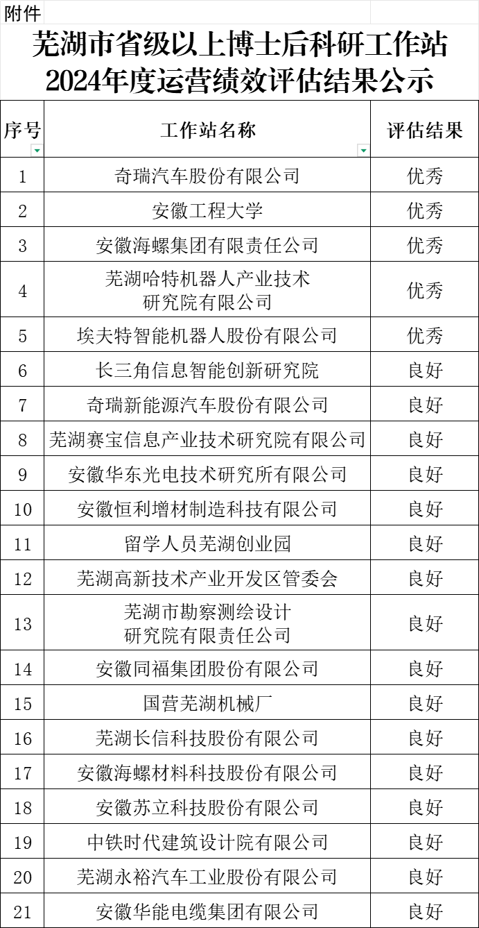 根據《關于修改<蕪湖市省級以上博士后科研工作站運行績效評估辦法>(暫行)的通知》(蕪人社秘〔2018〕124號)和《關于印發〈蕪湖市支持博士后事業發展實施細則〉的通知》(蕪人社秘〔2024〕106 號)文件精神,市人社局、市財政局共同開展了全市省級以上博士后科研工作站2024年度運行績效評估工作。