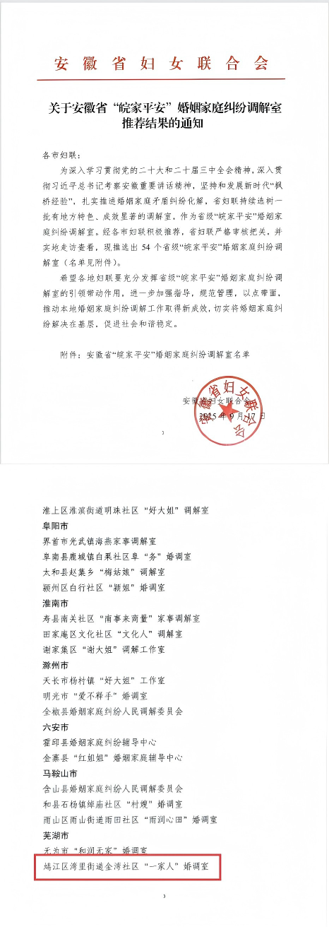 為深入學習貫徹黨的二十大和二十屆三中全會精神,深入貫徹習近平總書記考察安徽重要講話精神,省婦聯選樹了一批有地方特色、成效顯著的調解室作為省級“皖家平安”婚姻家庭糾紛調解室,其中鳩江區灣里街道金灣社區“一家人”婚調室成功入選。