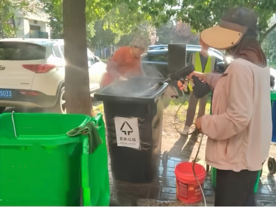 清洗車拉來高壓水槍,對準排排綠色垃圾桶。桶壁隔夜菜汁、油漬被水柱瞬間卷起,泡沫裹著異味流進排水溝。清洗人員的長柄刷上下翻飛,桶沿、桶蓋、輪子縫隙一寸不落。沖完數遍、再灑消毒水,垃圾桶褪去黏膩,恢復原本草綠。居民隨手掀蓋,一股清香先飄了出來,有人輕聲感嘆:“原來垃圾桶也可以沒味道。”